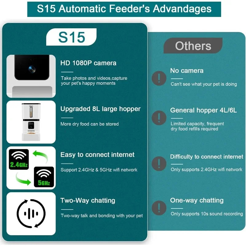 Automatic Dog Feeder with Camera: 5G WiFi Easy Setup 8L, Motion Detection, Smart Cat Food Dispenser 1080P HD Video Recording, 2-Way Audio, Timed Pet Feeder, App Control, Night Vision S15